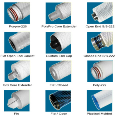 ใส้กรองแบบเชือก (StringWound Cartridge) ความละเอียดได้ตั้งแต่ 0.5-1500um วัสดุที่ใช้มีตั้งแต่ Cotton, PP. Glass-Fiber, PE, Nylon. ประสิทธิภาพกรองประมาณ 90%