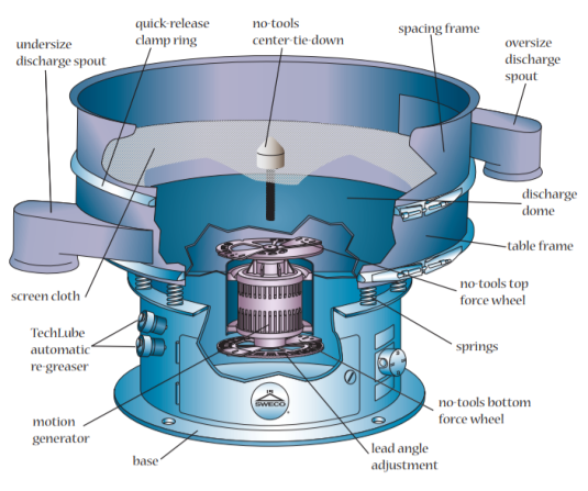 ข้อมูลทั่วไปSeparate solids from liquids or segregate dry materials into various sizes. Particles as fine as 400 mesh (37 microns) can be screened, with up to 4 screen decks incorporated in one Vibration separator. No special flooring or foundation is needed and less working floorspace is required. Simple and efficient design requires less horsepower. Other features include long screen life and ease with which screens may be changed.เป็นเครื่องที่สามารถแยกของแข็ง ทั้งแบบที่มากับของเหลวหรือแบบแห้งก็ได้ ความละเอียดได้ตั้งแต่ 37um ซึ่งสามารถคัดแยกได้ 4 ระดับความละเอียดพร้อมกัน โดยที่ไม่ต้องปรับพื้นแบบ Foundation ใดๆ พื้นที่น้อยในการติดตั้ง ใช้พลังงานต่ำ อายุการใช้งานยาวนานมีขนาดตั้งแต่ เส้นผ่านศูนย์กลาง 30 นิ้ว 40นิ้ว 48นิ้ว 60นิ้ว ให้เลือกตามความเหมาะสมการใช้งาน