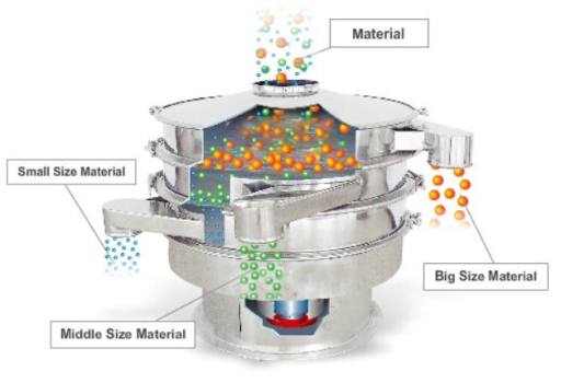 ลักษณะการทำงานBasically,theVibrationSeparatorisavibratoryscreeningdevicethatvibrates aboutitscenterofmass.Vibrationisaccomplishedbyeccentricweightsonthe upperandlowerendsofthemotion-generatorshaft.Rotationofthetopweight createsvibrationinthehorizontalplane,whichcausesmaterialtomoveacrossthe screenclothtotheperiphery.Thelowerweightactstotiltthemachine,causing vibrationintheverticalandtangentialplanes.Theangleofleadgiventhelower weightwithrelationtotheupperweightprovidesvariablecontrolofthespiral screeningpattern.Speedandspiralpatternofmaterialtraveloverthescreencloth canbesetbytheoperatorformaximumthroughputandscreeningefficiencyofany screenable product ... wet or dry ... heavy or light ... coarse or fine ... hot or cold.หลักการทำงาน โดยใช้วิธีการสั่นตะแกรงด้วย Motor ที่ออกแบบมาเป็นพิเศษ มีความคงทนสูง สามารถแยกของเหลวออกจากเศษต่างๆได้ ทั้งเหลวและแห้งสามารถใช้ได้เช่นกัน วัตถุที่ถูกคัดแยกจะเคลื่อนที่ไปยังช่องทางออกดังภาพอธิบายด้านล่าง