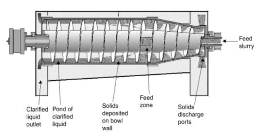 จะมีลักษณะทรงกระบอกแนวนอนหมุนด้วยความเร็ว และด้านปลายลักษณะเป็นกรวย Solid จะถูกเหวี่ยงติดไปยัง Bowl